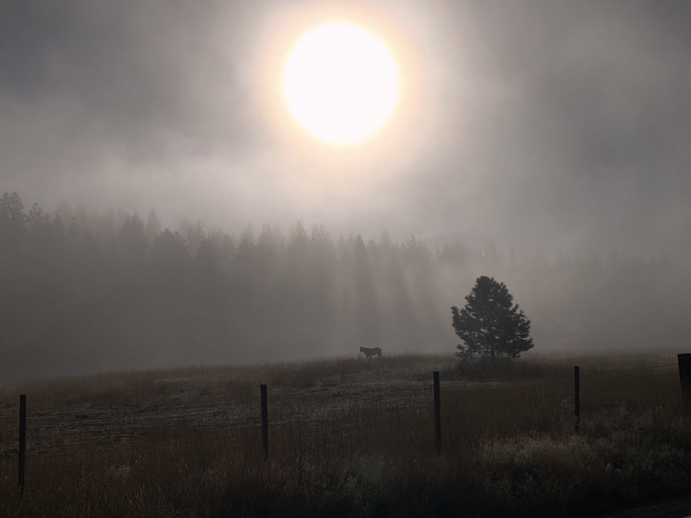 Was a foggy drive into town, i came around the bend and saw this spectacular view of a horse in a field with fog wrapped around the trees.
