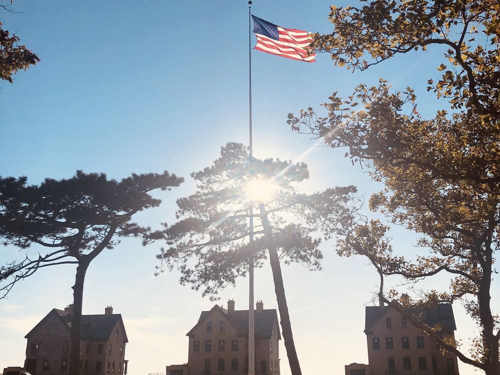 These are just 3 of 18 beautiful homes referred to as Officers Row. Some of the homes lay in somewhat ruins, but others are restored. This was taken while walking the MUP at Sandy Hook Gateway National Rec Area in NJ, facing bayfront. The way the sun was shining through the trees and Old Glory was flying high and perfectly, it made for a beautiful shot with those beautiful offers homes.