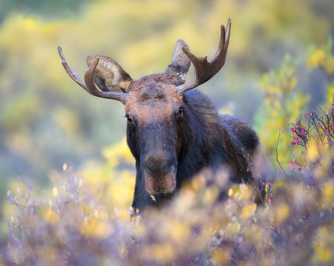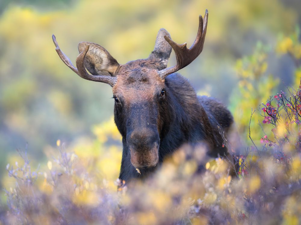 A bull moose is astonished when the photographer emerges from the thick cover of Rocky Mountain willows and serviceberry in the subalpine zone near the Continental Divide in Colorado.