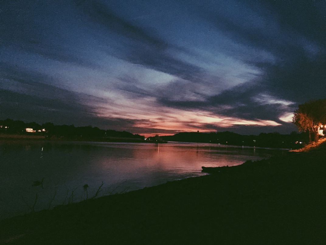 This photo was taken October 8th, 2015 at the Ohio River. The sky in the photo was right before the sun set completely, creating a colorful sky reflecting on the water.