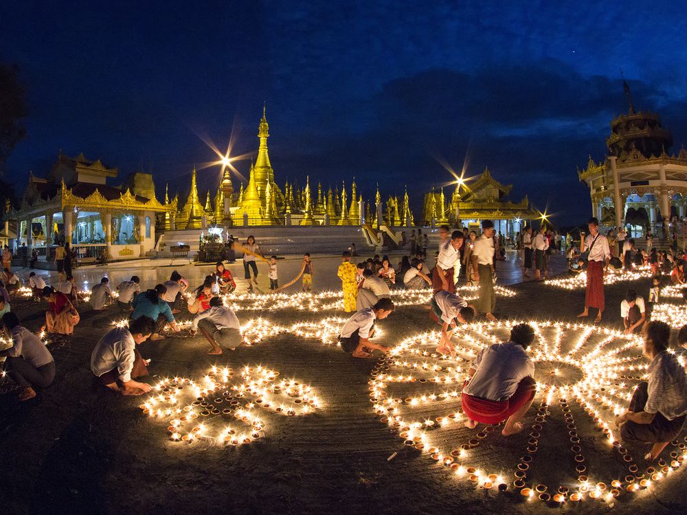 Every full moon day of Thidingyut( October), people gather at Kyeik Wine Pagoda and offer small oil lamps in the whole compound.
