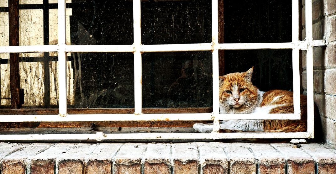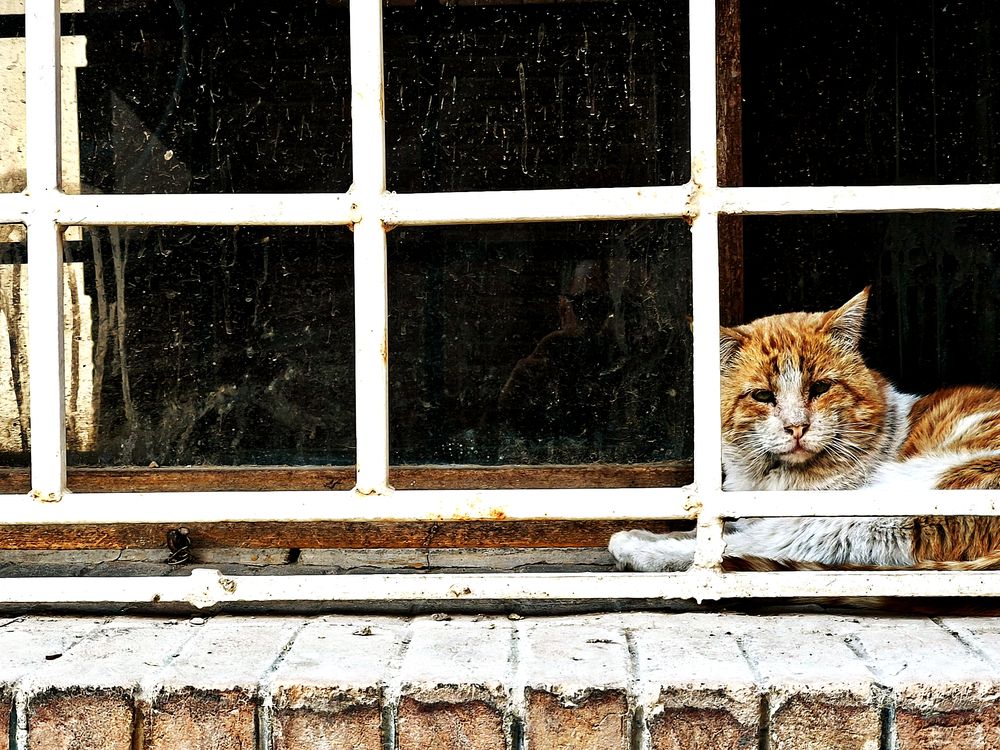 This photograph portrays an old cat seeking refuge at the window of the National Museum, escaping the torment of other cats. The image conveys both fragility and resilience, turning a fleeting moment into a timeless story.