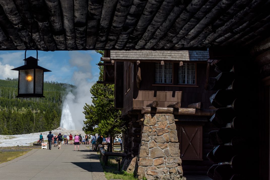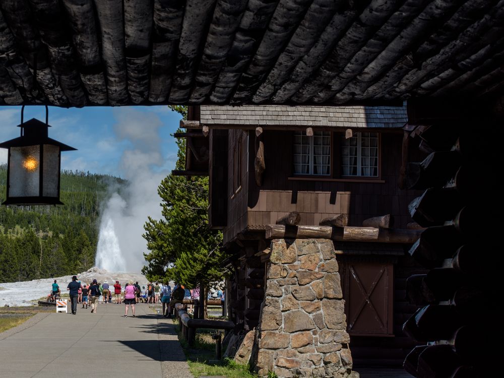 I took this picture during the pandemic when the Old Faithful lodge was closed. We wanted to check it out from inside but could not due to closure. This was the only way to keep the memory (at least till the next time). The lodge ceiling and the lamp in the foreground kind of give it vintage look (not sure how vintage they might be) while displaying the Old Faithful Geyser in the background. It also gives the picture a sense of place.