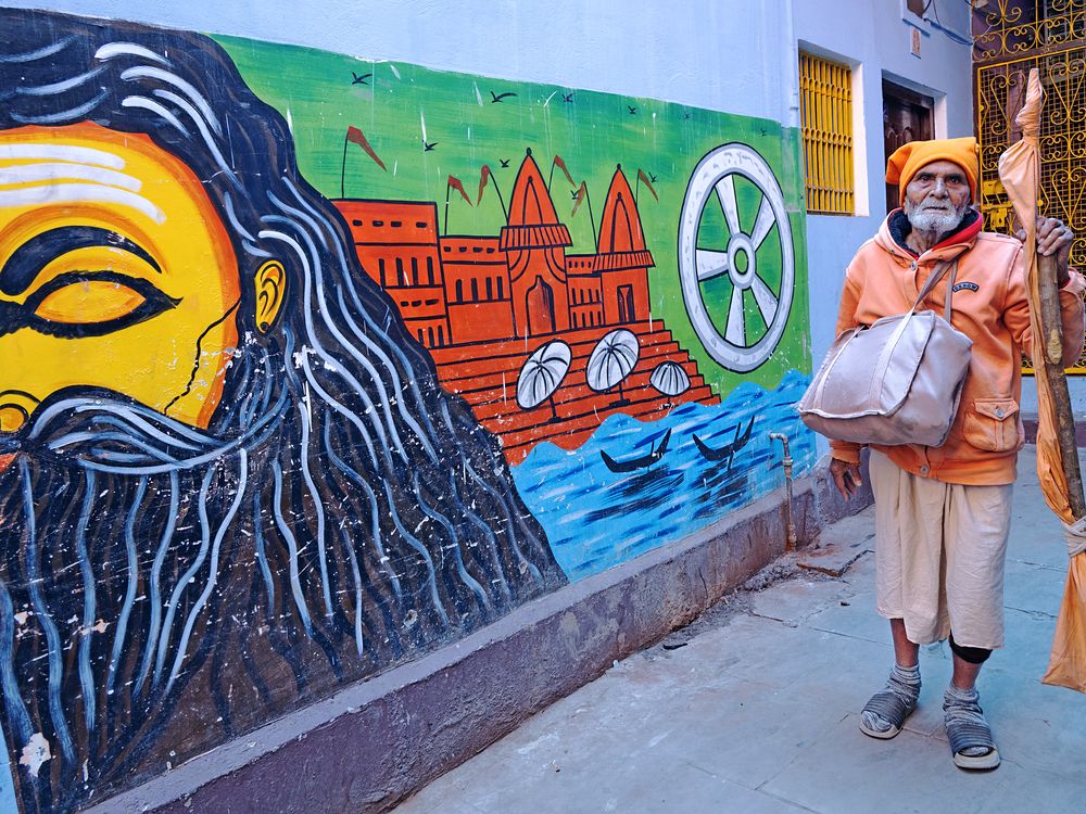 An old man is moving alone by a wonderful wall where images of the God of Hindu Mythology have been painted.