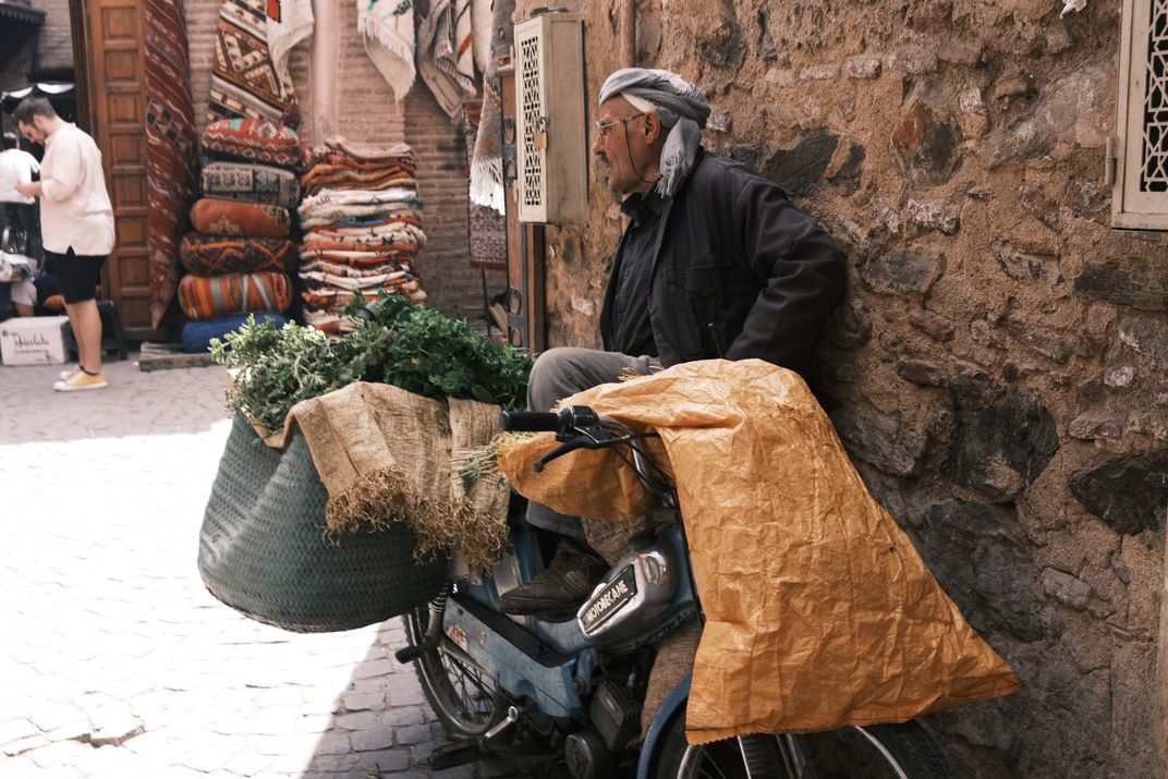 Walking aimlessly in Marrakech's sleepless square, I ran into an old Marrakech man selling vegetables in the morning. I ran into him again in the afternoon when I returned from the east side to the west side, and he remained in the same position on his motorcycle selling vegetables.