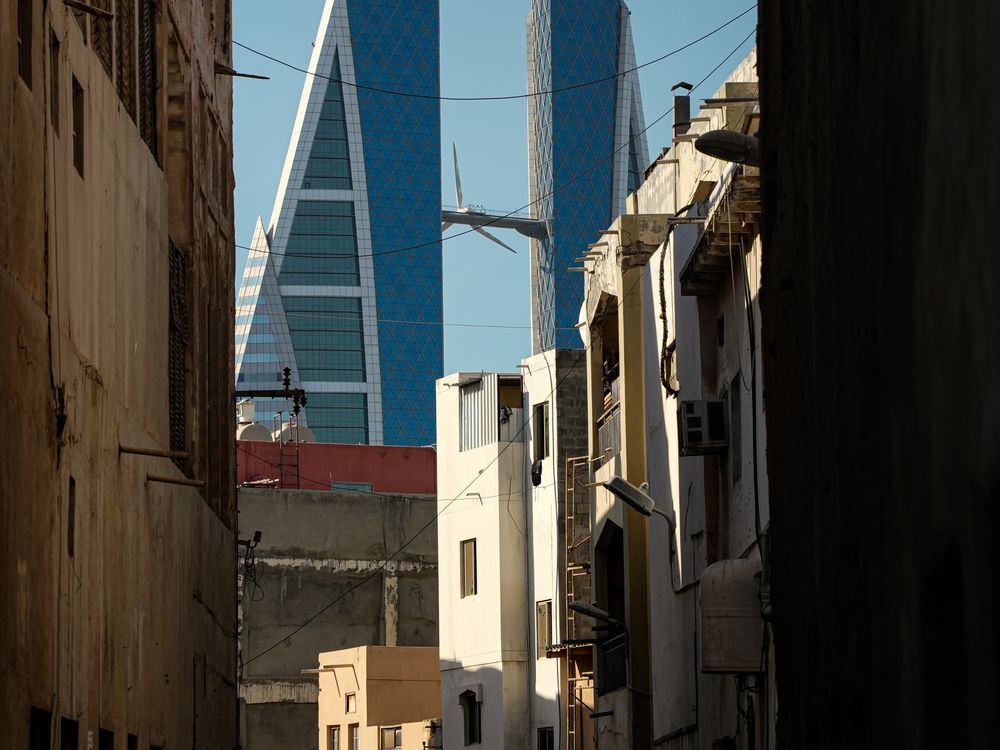 Old Manama alleyways contrasted with the rise of modern Bahrain