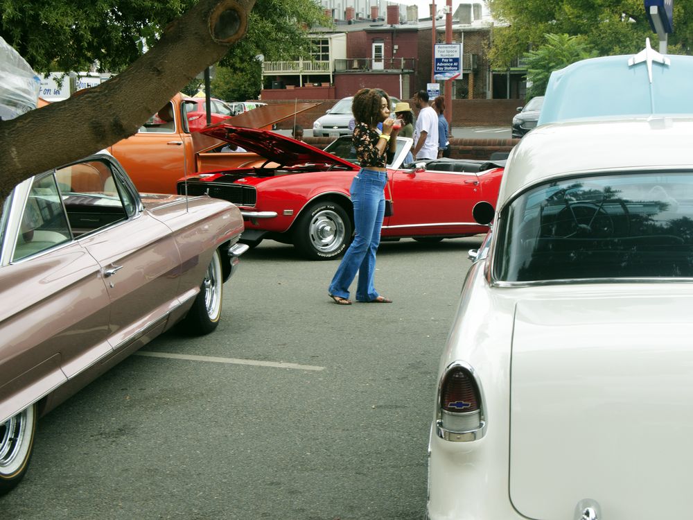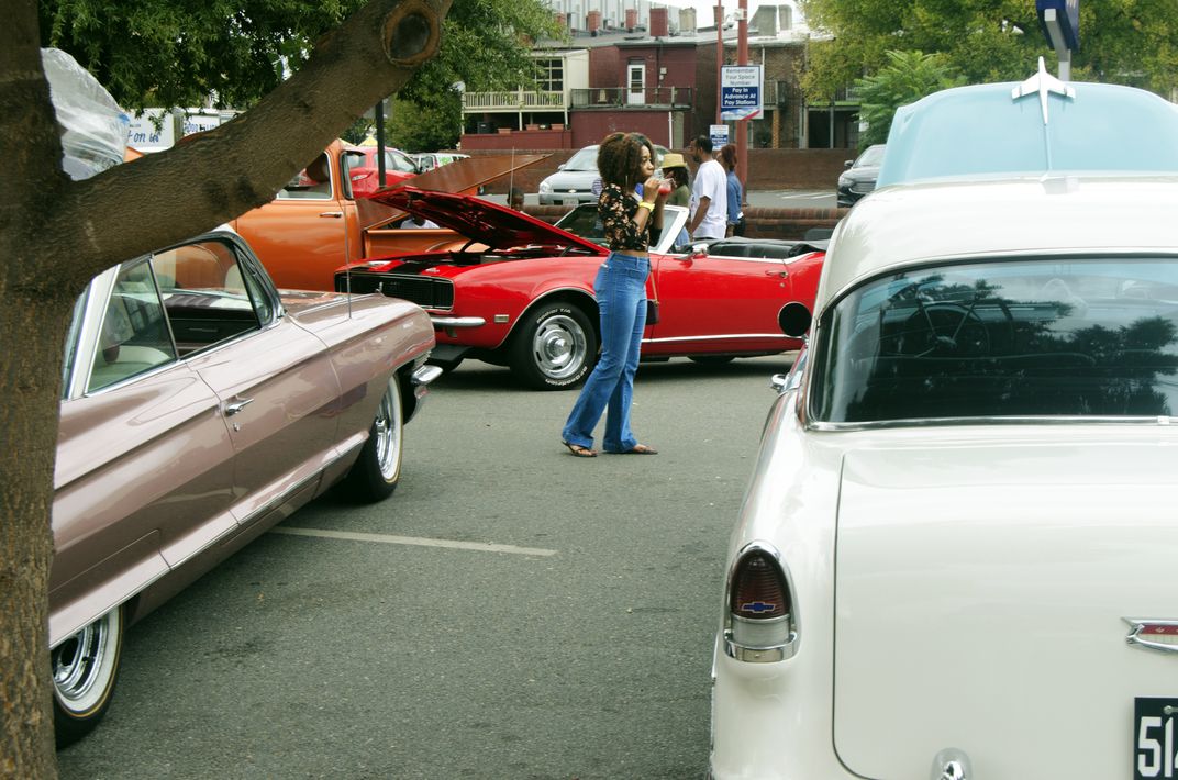 This photo was taken in Richmond, Virginia at the 29th annual 2nd Street Festival. The festival celebrates the rich culture of the historic Jackson Ward neighborhood located in the city Richmond. There was car show at the festival so I decided to take some interesting compositions of the antique cars. A young woman admiring the cars seemed to naturally frame herself in between these antique vehicles. Her style reminds me of the old school Chevrolets and Fords that were parked out there. As she walked, I decided to capture the exact moment where she is surrounded by cars on each side.