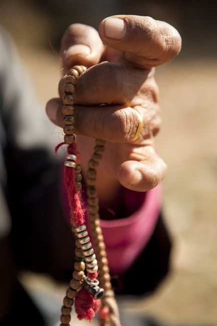 old Tibetan woman with prayer beads in a Tibetan refugee camp in India
