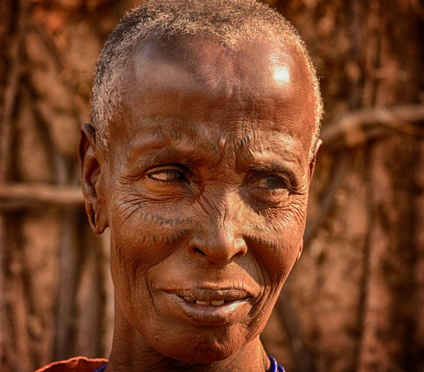A woman of the Datoga tribe in Tanzania has dark marks on her face that are a result of traditional scarification.