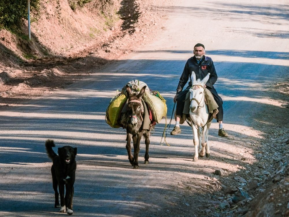 An old villager is riding his donkey towards his home.