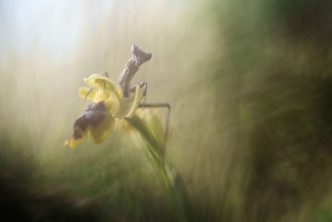 A low angle shot of an Ameles heldreichi on an Ophrys lutea ssp. galilaea. I love the menacing aura of the mantis from this angle, which is represented by the name Olethros.