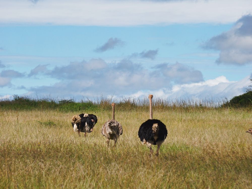 Outside Nairobi, three ostriches return to safety after crossing paths with a warthog being hunted by a pack of lions at sunrise.