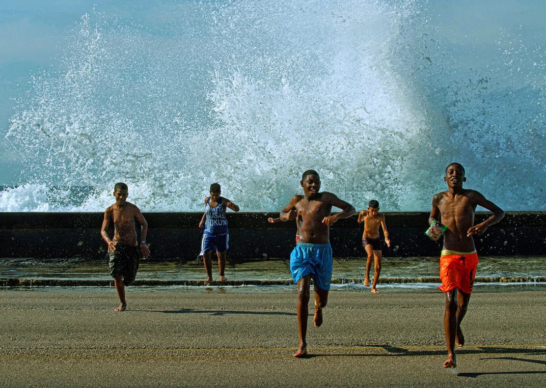 Innocent children running across Malecon street, on a stormy day, with waves several meters high. They remind us of our childhood, a pure and untainted time like a blank sheet of paper untouched by any practical calculations.