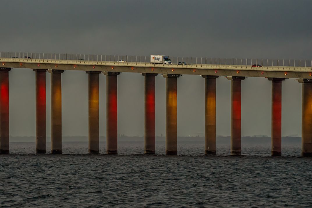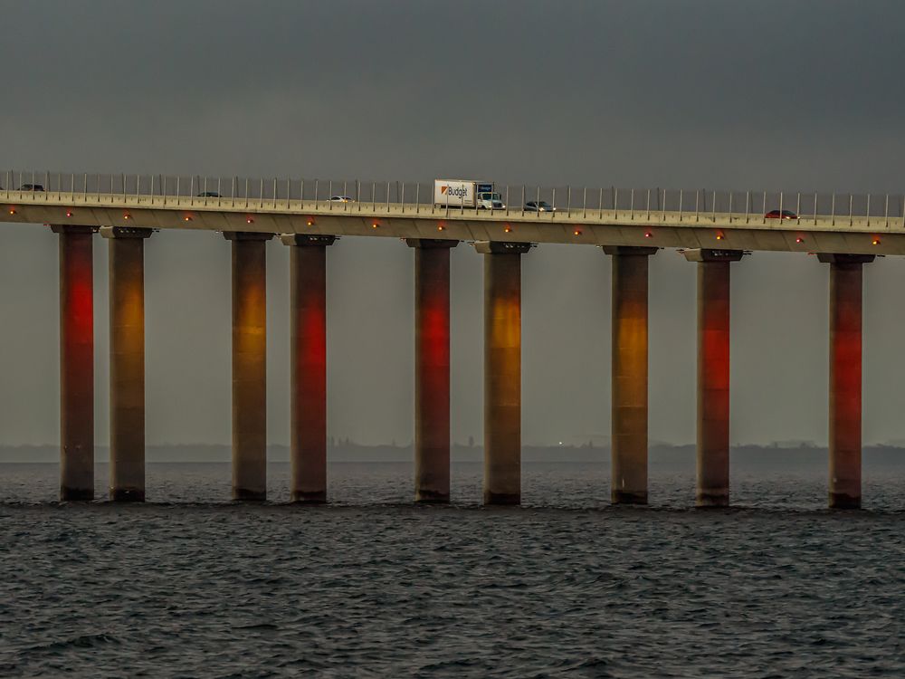 On storm filled evening, rush hour traffic crossed Skyway Bridge’s elevated approach