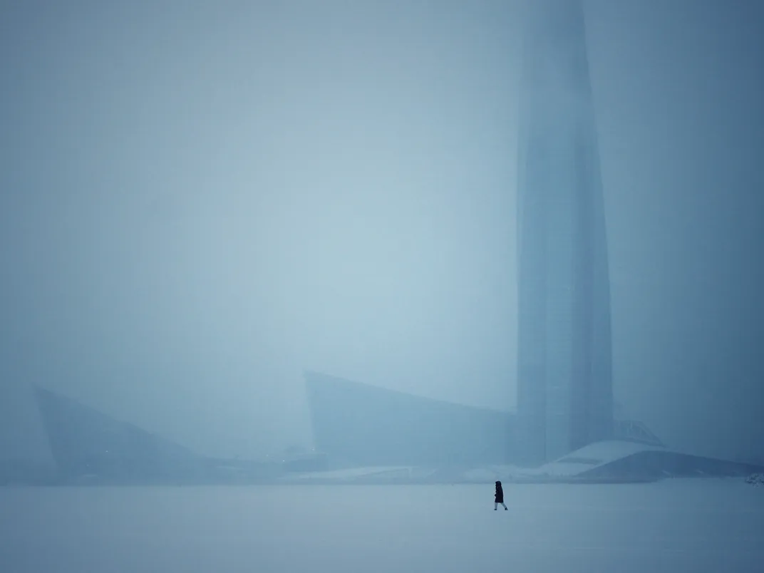 a person walking on the frozen Gulf of Finland in front of Lakhta Center (the highest building in Europe) while it is snowing