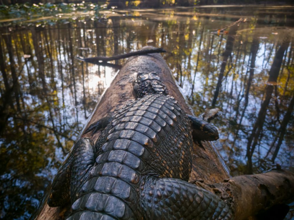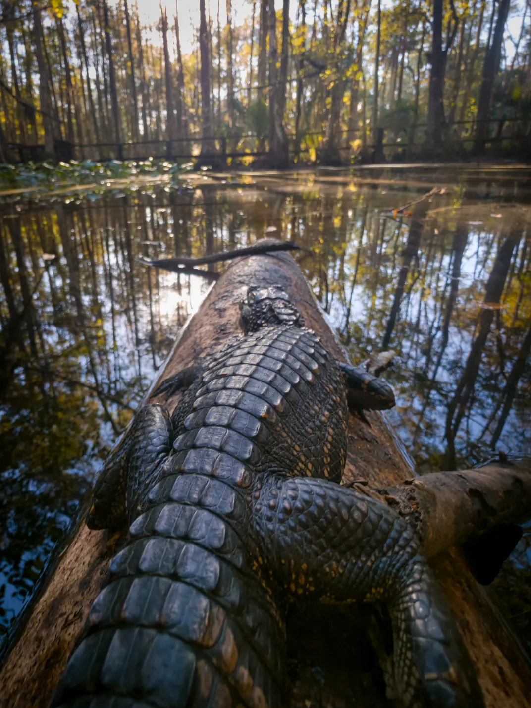 A wild baby alligator rests on a fallen log at sunset. I lay at water level behind it with an ultra-wide mobile lens to capture its world from its own point of view, letting the wetlands reflect the fading Florida light around us.