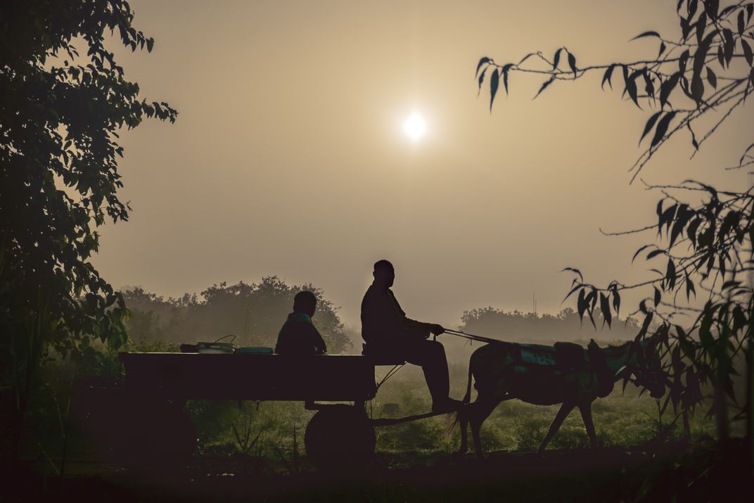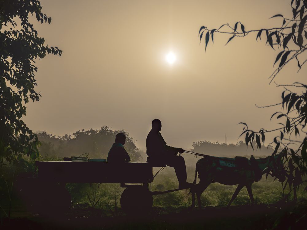 A photograph of a primitive cart pulled by a donkey and driven by a man, with his wife sitting in the back of the cart, as they travel through the fields in the early morning after sunrise, facing the sun. This creates a silhouette with the orange sunlight, giving the photograph a unique character.