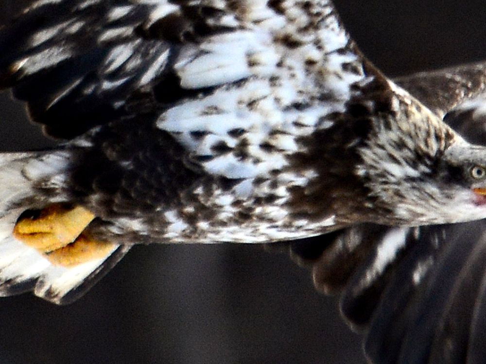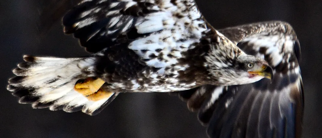 An immature bald eagle extends its wings, its beak still covered with blood from a fresh kill, as it departs a cornfield area in rural upstate New York.