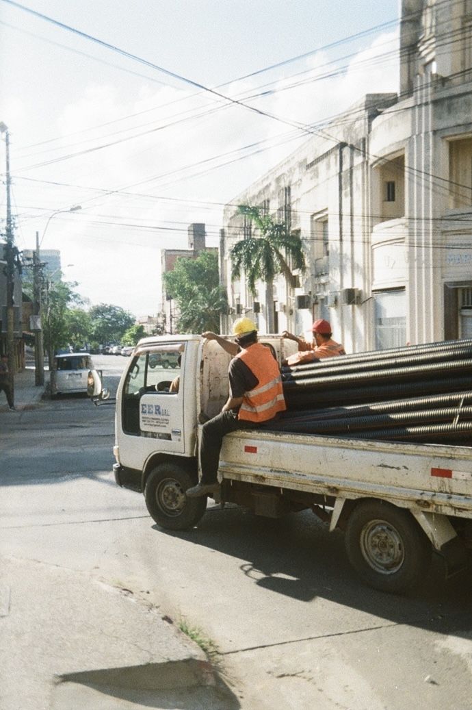 Captured on the streets of Asuncion: Two construction workers sitting on the back of a truck next to large pipes.