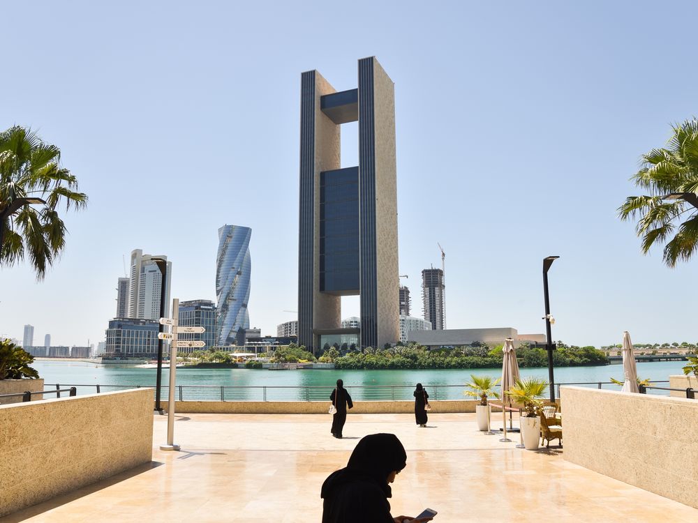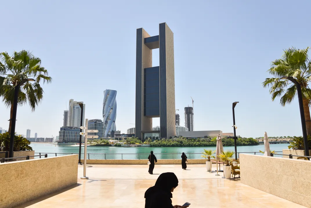 Three women leaving a shopping mall and walking towards the futuristic towers of Bahrain's capital Manama.