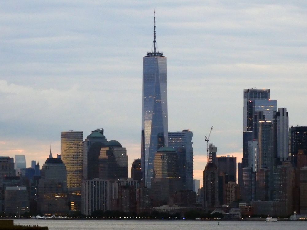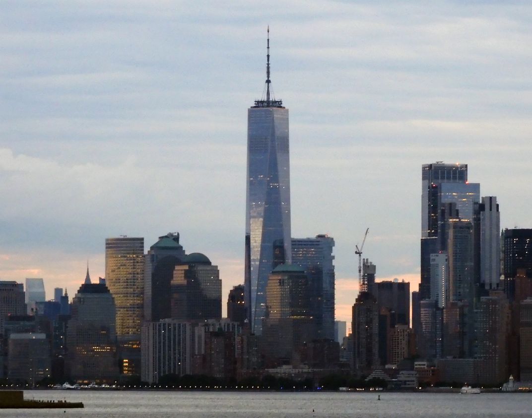 One World Trade Center, has a casual cafe, a bar with small plates & American fine dining with views from the 101st floor. Viewed from mouth of Hudson River while approaching the Cape Liberty New Jersey Cruise Port.