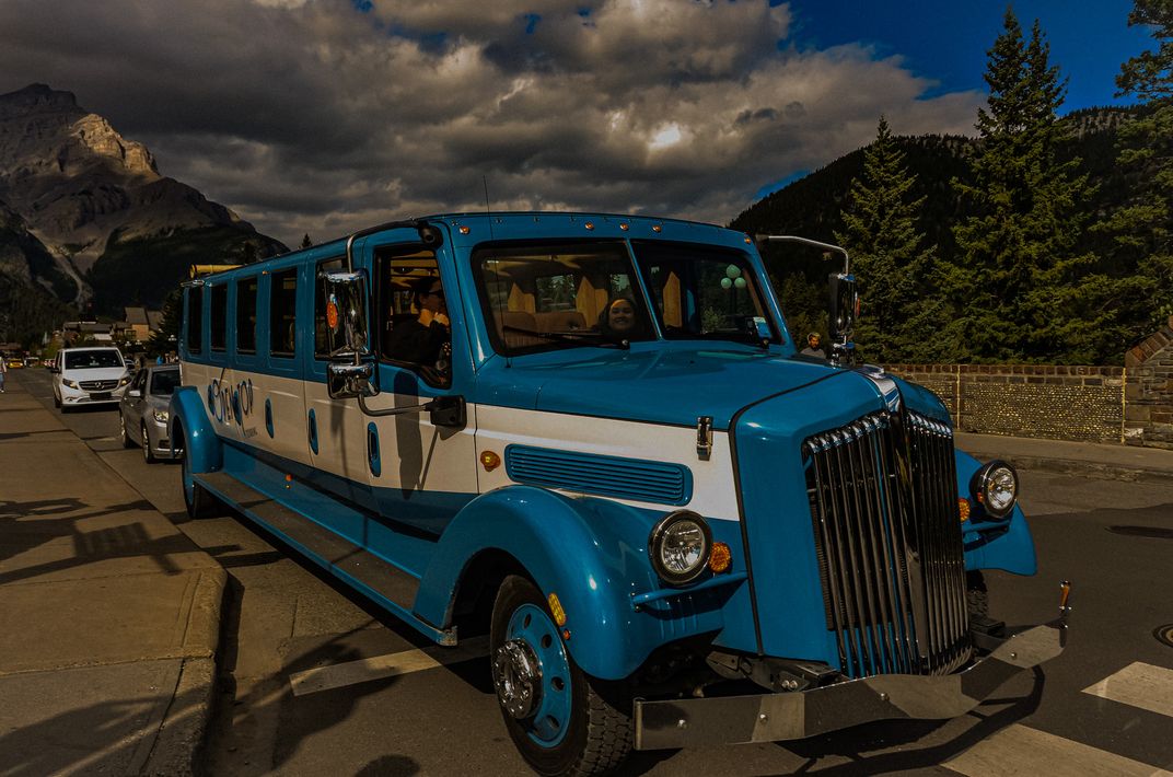 This picture depicts an Open Top Tour Vehicle in Banff, Alberta.