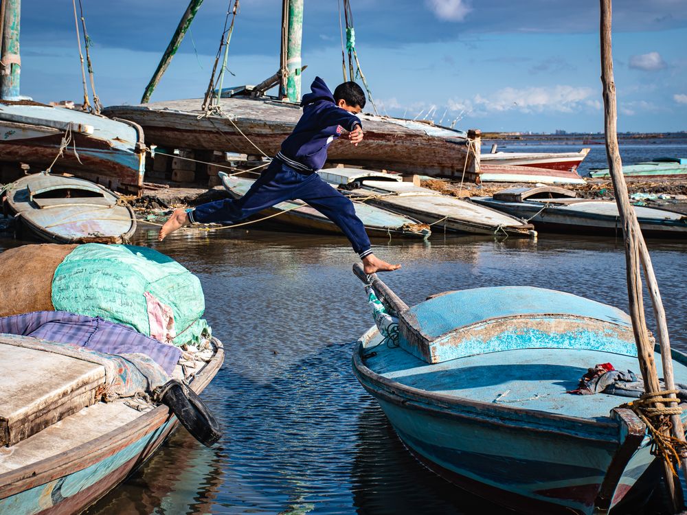 Capturing the moment of the boy playing and jumping between the boats parked in the lake inside one of the villages of the Egyptian countryside.