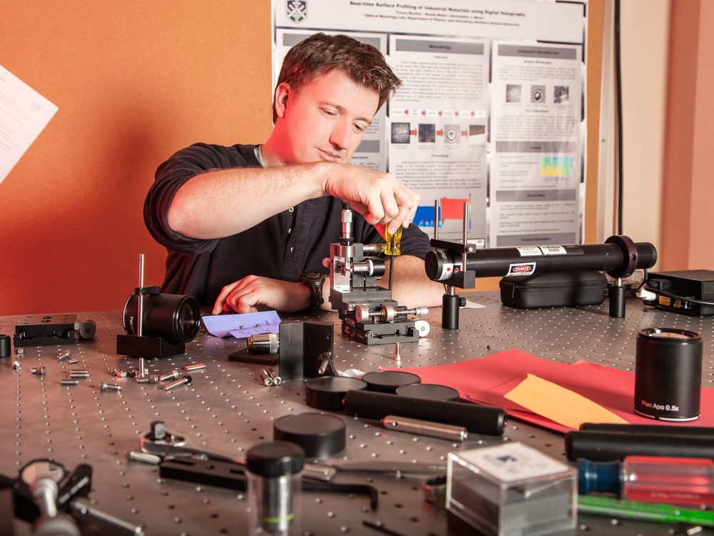 Christopher Mann, Assistant Professor, Department of Physics And Astronomy. Pictured is Chris Mann in the Optical Metrology Lab. The Optical Metrology Laboratory (OML) is a research and development group located within the Physics and Astronomy Department at Northern Arizona University (NAU). The group currently consists of three graduate students and three undergraduate university students working towards obtaining their degrees in Physics, Electrical Engineering, and Computer Science. We conduct applied optics research and development addressing important issues of industrial and economic competitiveness, biomedical measurement science, and national security.