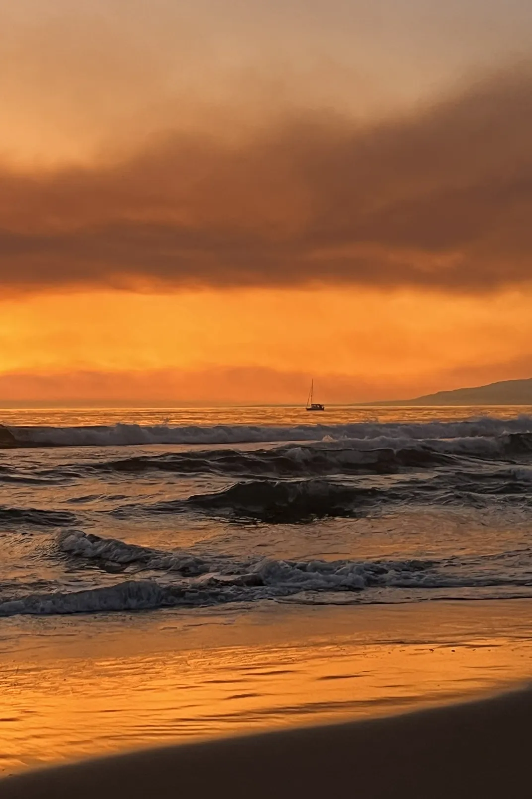 A boat sails on the Pacific Ocean on the third day of the Pacific Palisades fire. Orange is a common color in our Southern California sunsets but rarely are the variations this intense. This was the first boat I had seen in days.