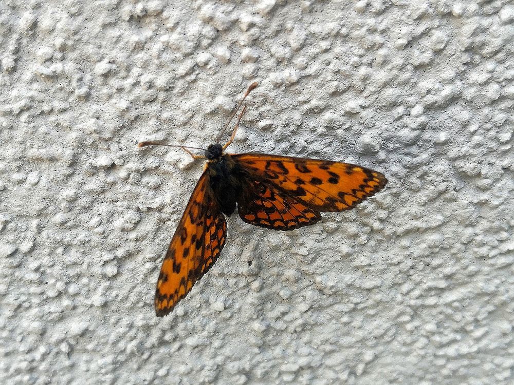 A butterfly resting on a textured wall, its bright orange wings contrasting with the grey stone. This simple moment shows the beauty of resilience in nature—how even the smallest creatures bring color and vibrancy to unexpected places.