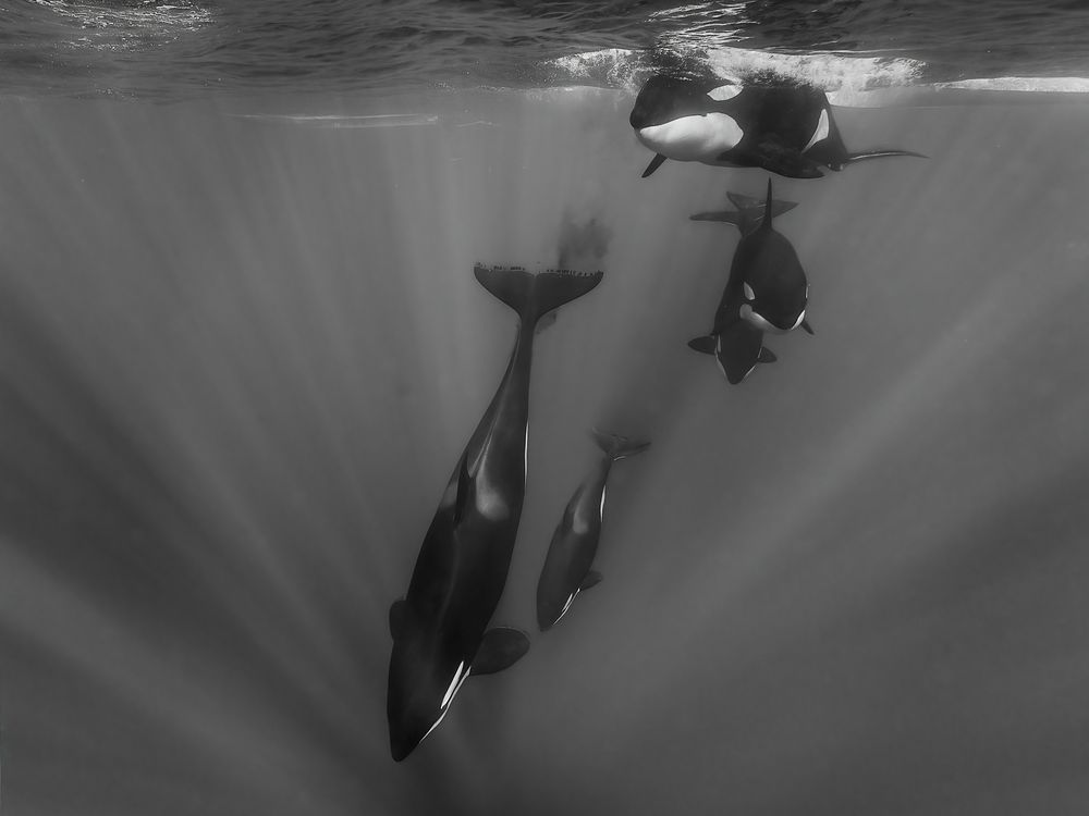 A family of orcas swimming in the waters of the Sea of Cortez while being bathed in sunbeams.