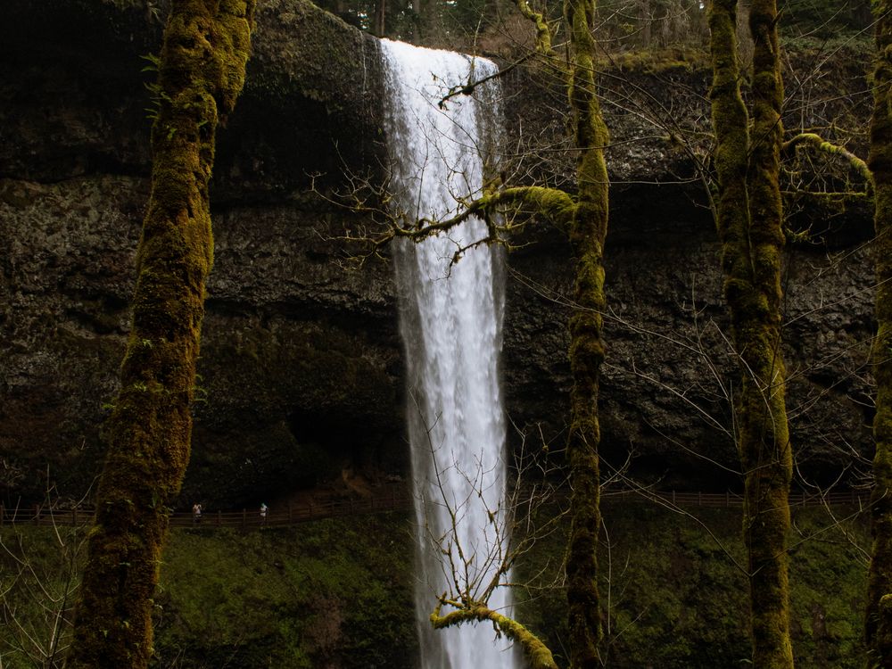 This is a photo of a waterfall along a trail in the Silver Falls State Park in Oregon. The trail goes under the waterfall as well.
