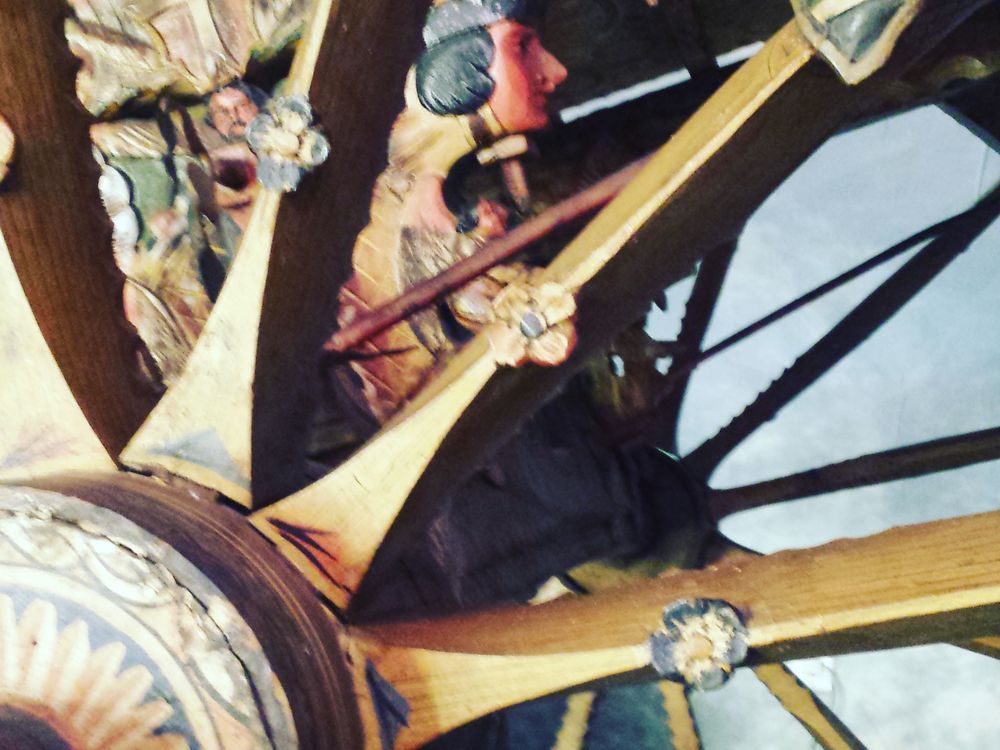 Ornate carving and painting on a restored antique Spanish donkey cart.