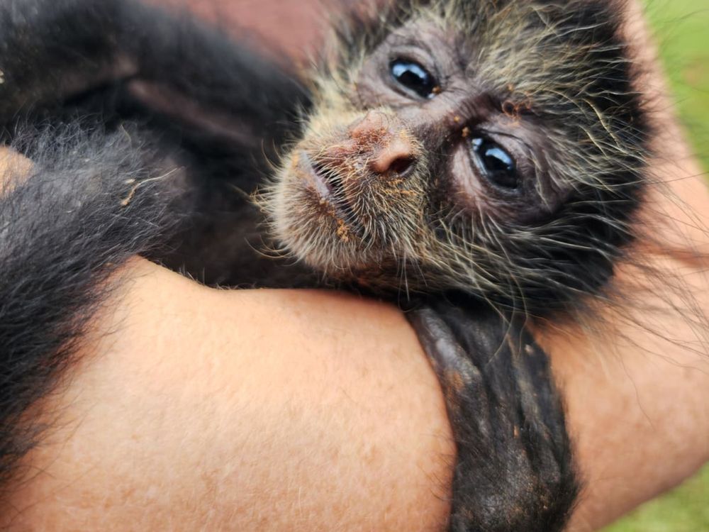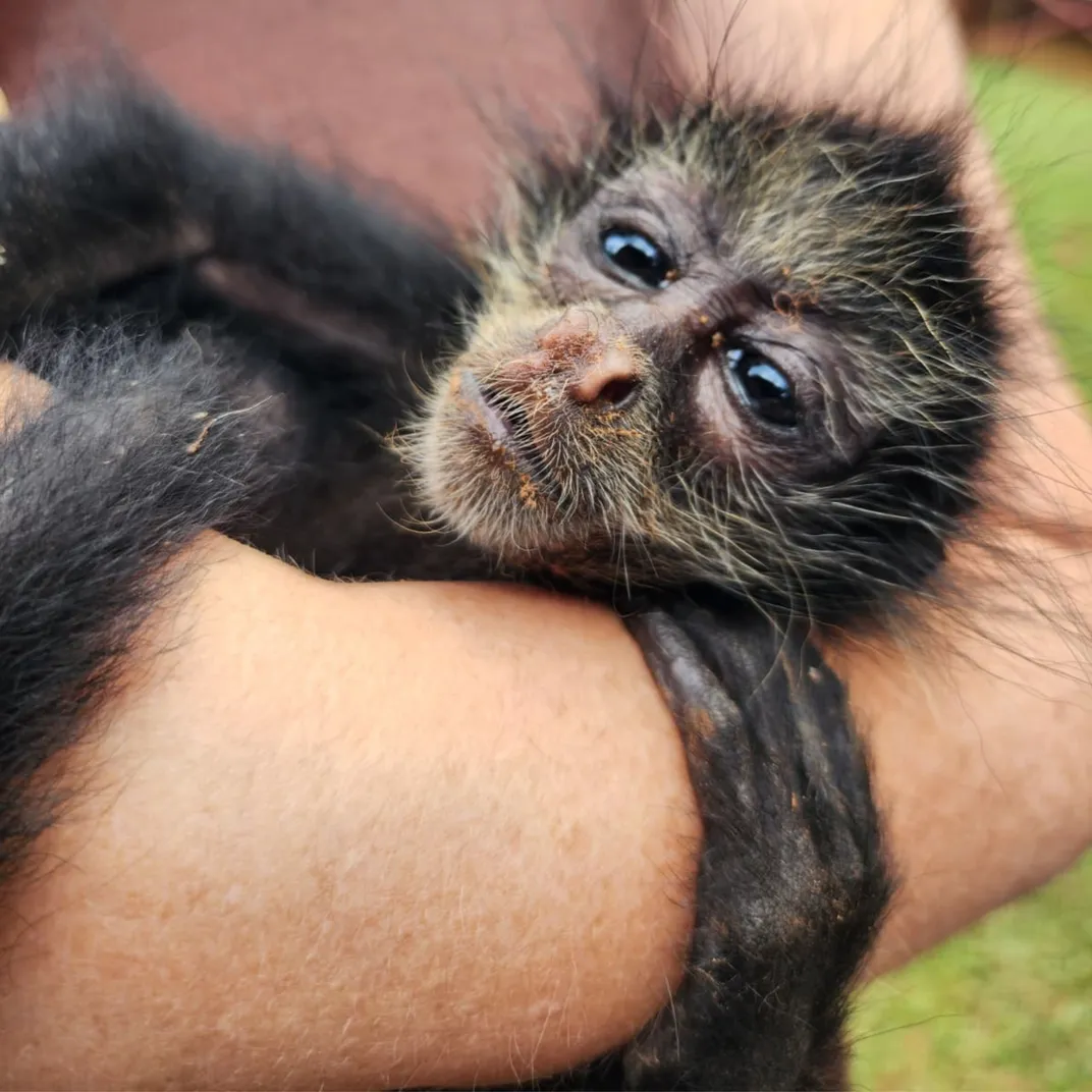 Cradled softly in caring arms, this young spider monkey gazes up with quiet curiosity and trust. Its wiry fur and expressive eyes tell a story of both fragility and resilience, a small soul shaped by the rhythms of the Panamanian rainforest. The close-up moment reveals the deep connection between people and wildlife that defines daily life in the Emberá community.
