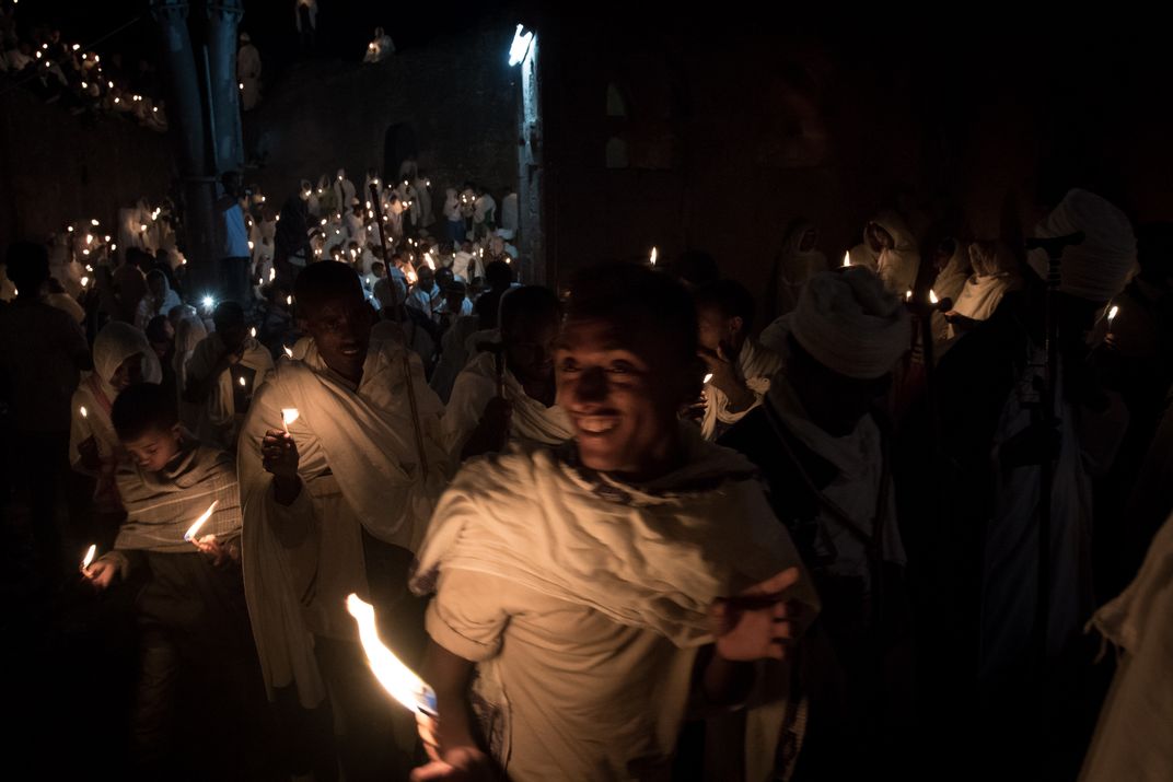 On Easter Eve, hundreds of Ethiopian orthodox pilgrims go to churches and celebrate with lit candles. During the celebration, all Ethiopians wear traditional white clothes, called habesha libs.