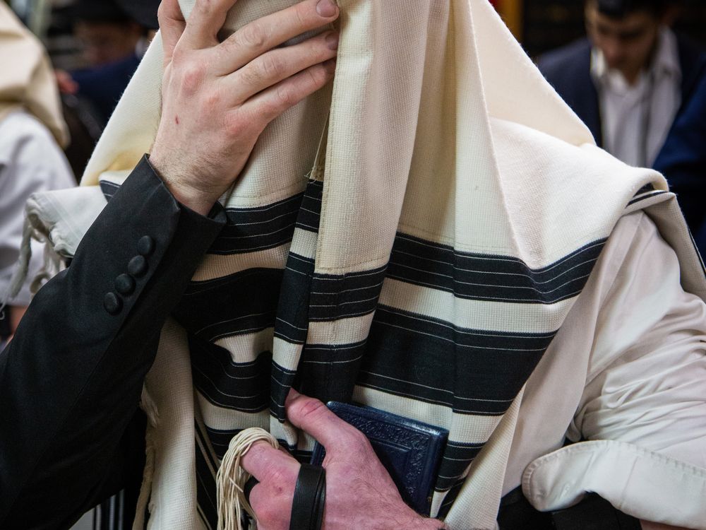 An orthodox Jewish man uses tefillin during weekday prayers at Chabad Lubovitch.