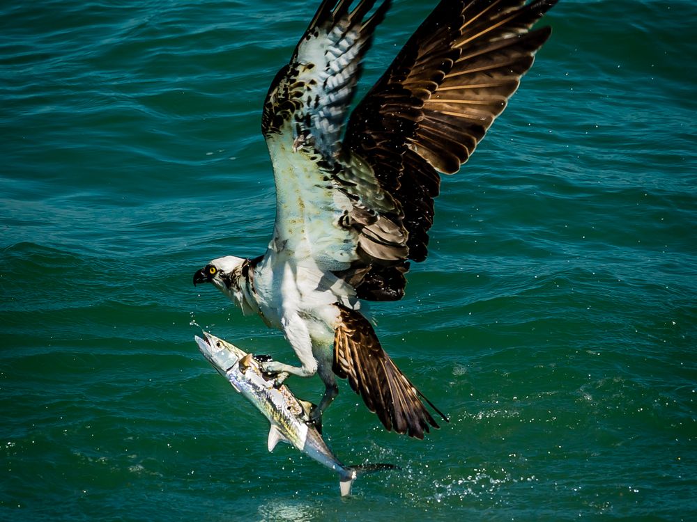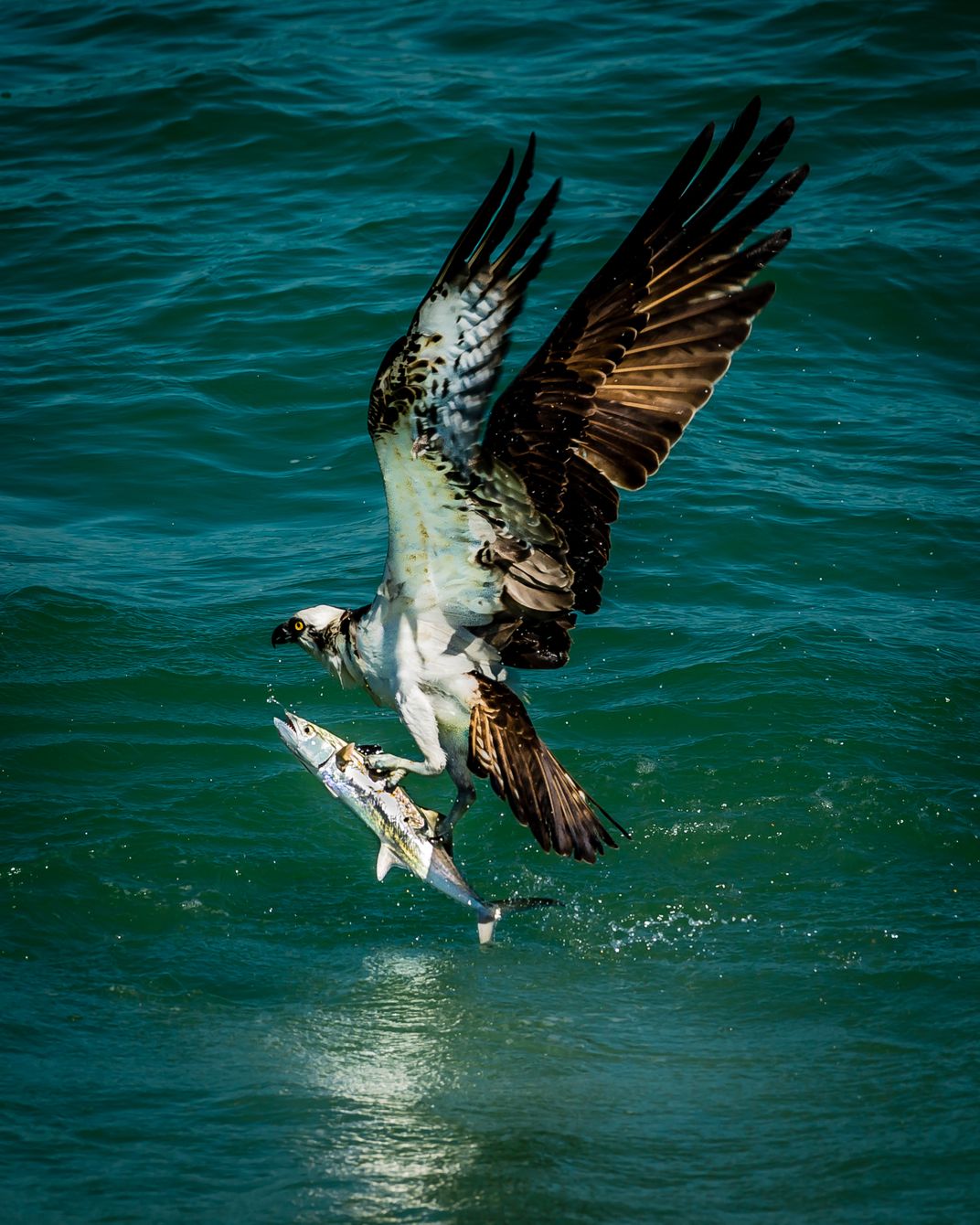 I was photographing Wildlfe standing on a beach in Florida. Ospreys occassionally were fishing offshore heading north. This osprey didn’t seem to have any difficulty catching and flying off with this sized fish.