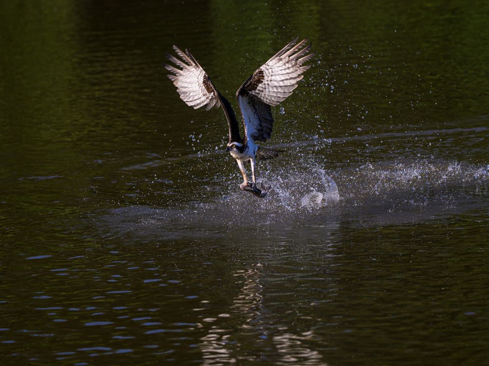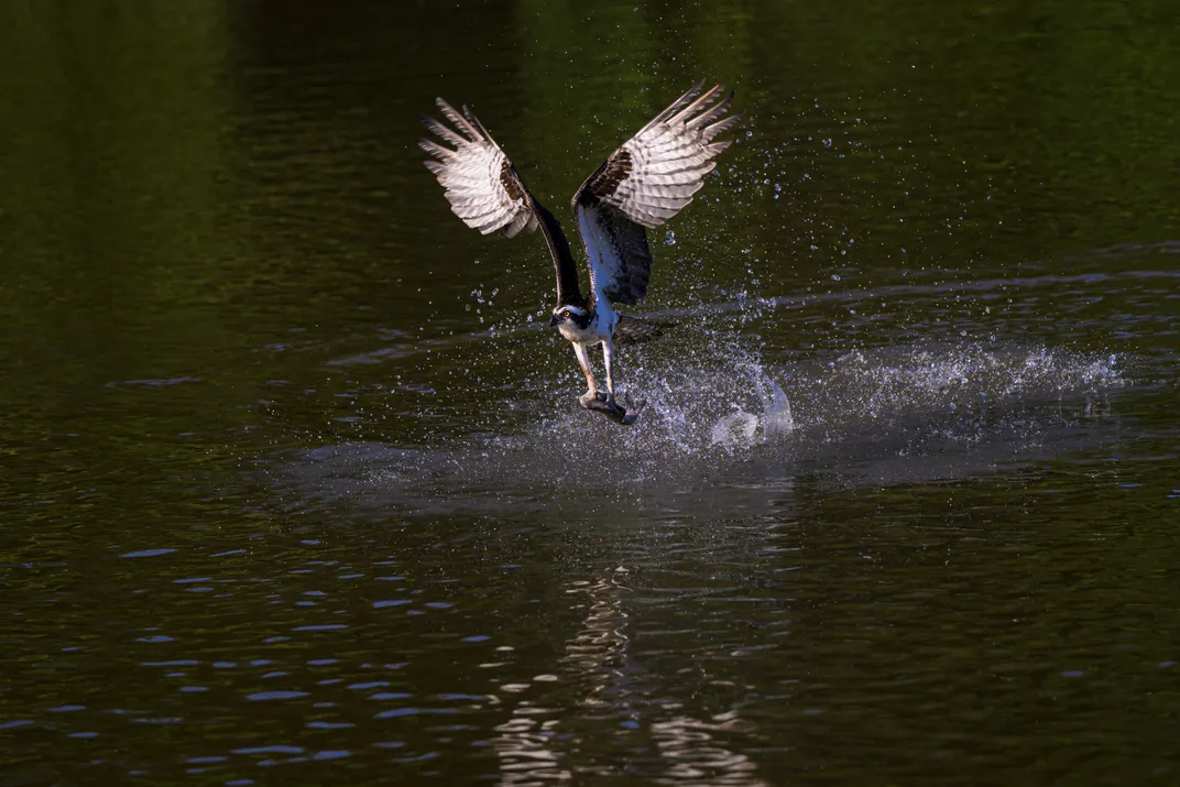 Osprey are excellent hunters and have a high success rate once they have spotted a fish. In this photograph we see an osprey taking off into the early morning sun, pulling a fish out of the James River.