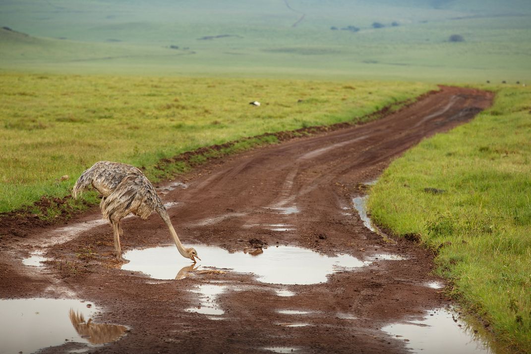 The ostrich stepped into the road and leaned to drink water from the puddle created after night of heavy rains.