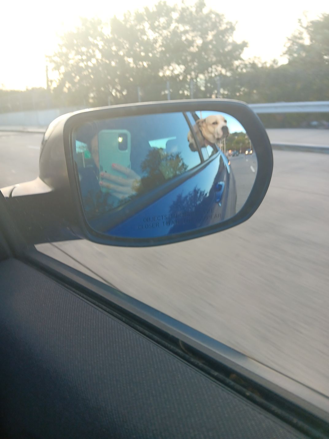 Freedom. Travel. Jackie the puppy in our car in the mirror!!!!! What a great shot.