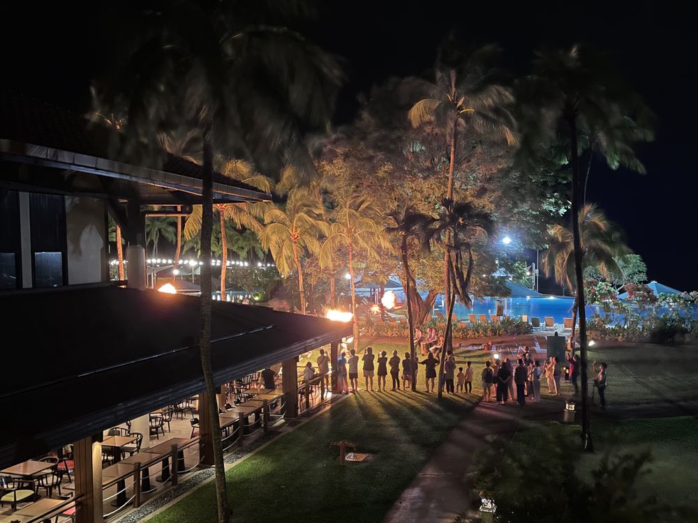 Under a canopy of towering palm trees, a group of people gathers on a lawn at night, illuminated by warm lights and the distant glow of a resort pool. The scene captures a tropical evening event, with the shadows of the palms lengthening across the grass as the group watches a performance or shares a moment of collective celebration beneath the dark sky.