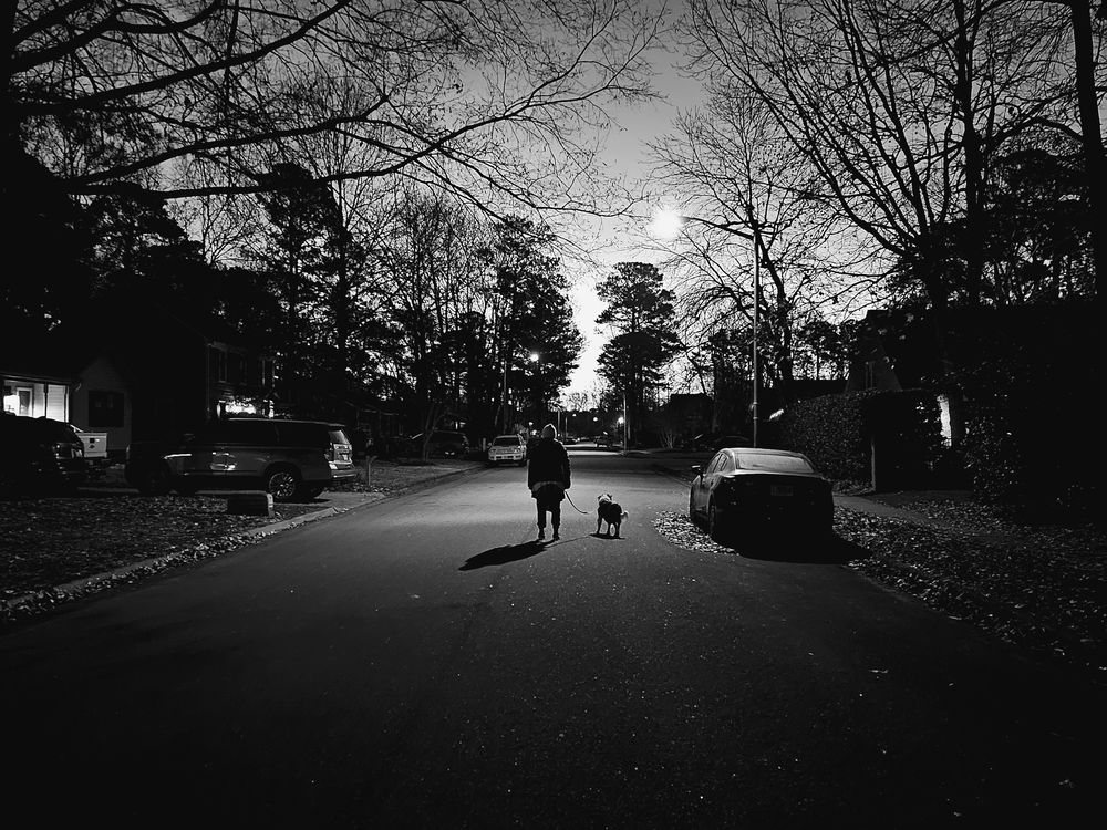 A person walking their dog in winter under a street light
