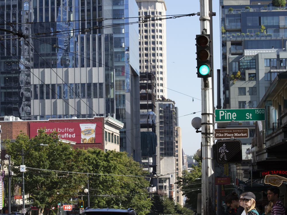 Travelers explore the area surrounding Pike Place Market in Seattle