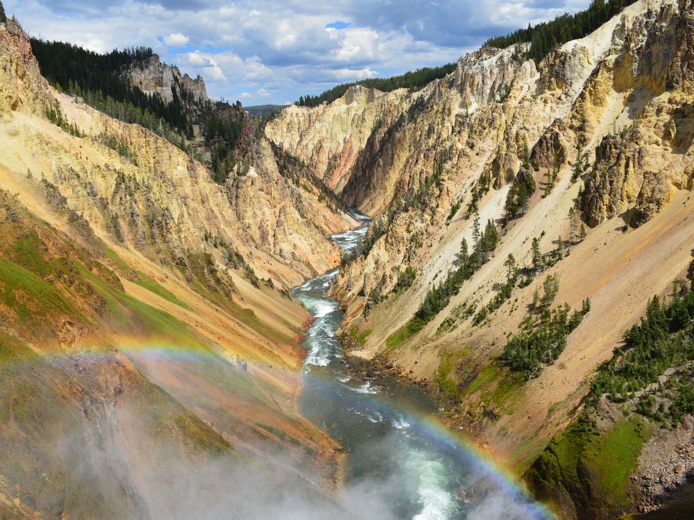 A rainbow appeared on a partly cloudy day while visiting Yellowstone Falls in Yellowstone National Park. As a first time visitor, it was a glorious welcoming.