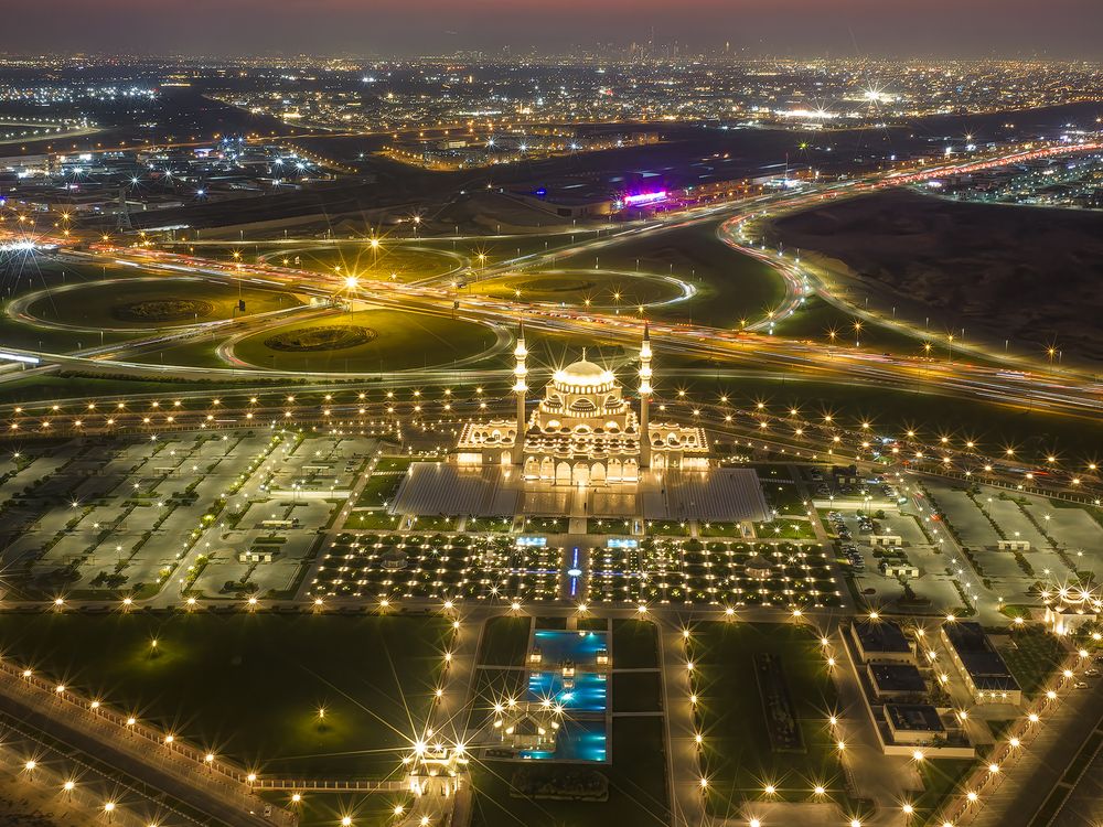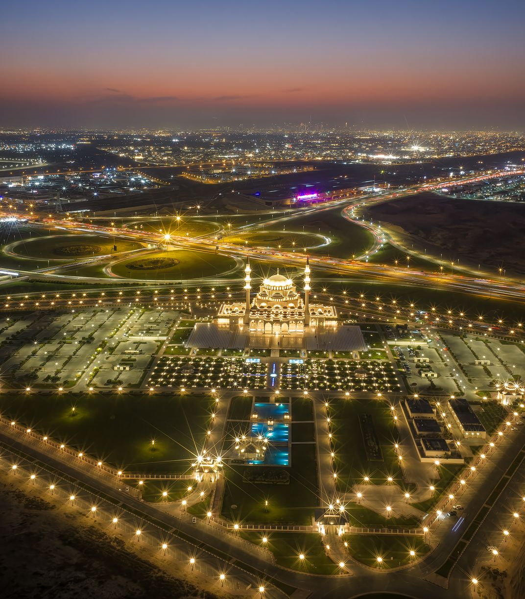 The Sharjah Mosque is the largest mosque in the Emirate of Sharjah in the United Arab Emirates. I was able to fly my drone photographing the beautiful mosque wit the blue hour and lingering colors from sunset.