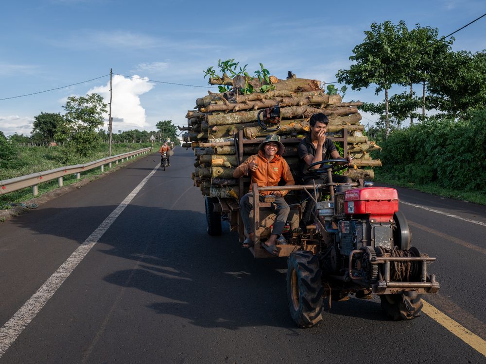 A striking image of rural transport and resourcefulness captured on the highway leading to Tây Nguyên. Two men—one driving and one riding shotgun—maneuver a heavily modified tractor pulling an immense, precariously stacked load of logs or firewood. This scene highlights the ingenuity, dedication, and often challenging conditions of transporting goods in rural Vietnam. Against the backdrop of a bright sky and green roadside foliage, the photograph serves as a powerful visual of the region's agricultural and logistical realities.