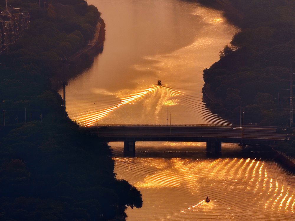 Warm golden sunlight spreads across the water’s surface. As a boat passes, it stirs ripples that shimmer across the river, contrasting with the lush green vegetation on both banks and the bridge spanning the water. The city’s waterways are bathed in a soft “golden satin,” where the interplay of movement and stillness evokes a soothing, twilight serenity.