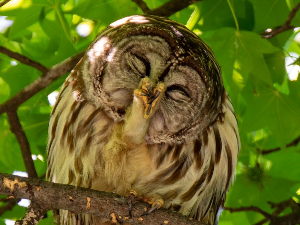 Barred owl waking from a nap to scratch an itch