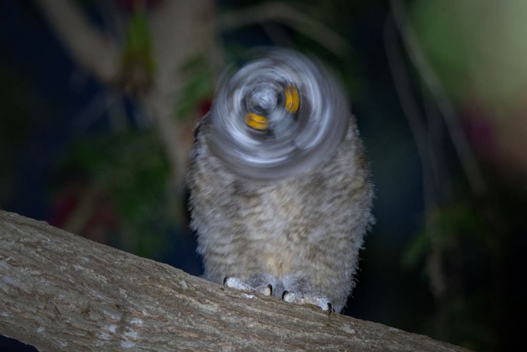 A long-eared owlet put up a captivating spectacle for several minutes, before suddenly engaging in a mesmerizing, head-spinning frenzy.