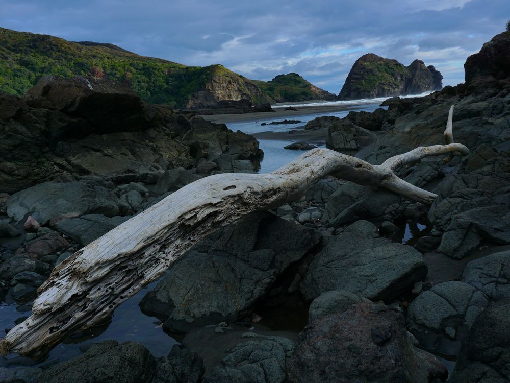 beach driftwood along volcanic shore